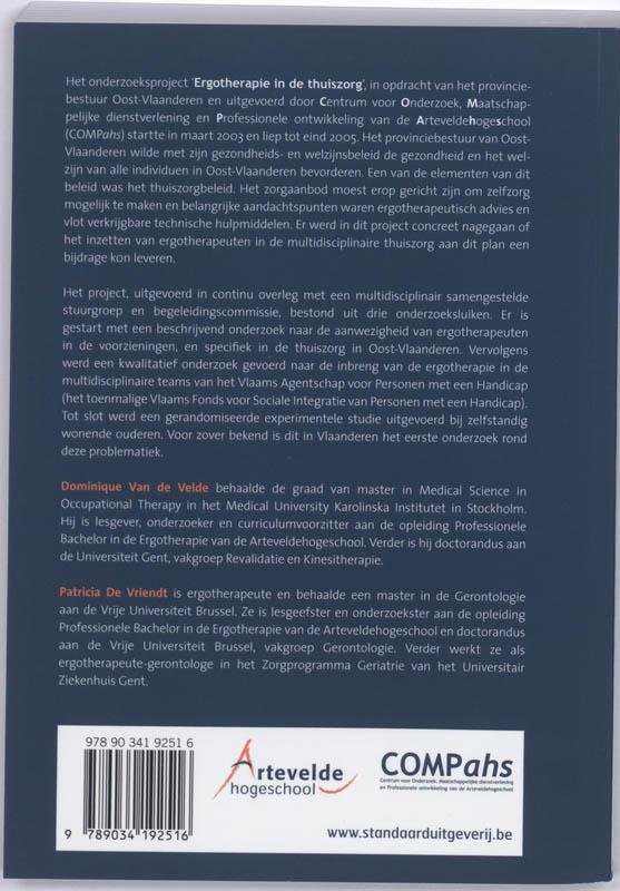 Ergotherapie in de thuiszorg is een onderzoeksproject waarin concreet werd nagegaan of het inzetten van ergotherapeuten in de multidisciplinaire thuiszorg een bijdrage kon leveren.Het project, uitgevoerd in continu overleg met een multidisciplinair samengestelde stuurgroep en begeleidingscommissie, bestond uit drie onderzoeksluiken.Er is gestart met een beschrijvend onderzoek naar de aanwezigheid van ergotherapeuten in de voorzieningen, en specifiek in de thuiszorg in Oost-Vlaanderen.Vervolgens werd een kwalitatief onderzoek gevoerd naar de inbreng van de ergotherapie in de multidisciplinaire teams van het Vlaams Agentschap voor Personen met een Handicap (het toenmalige Vlaams Fonds voor Sociale Integratie van Personen met een Handicap).Tot slot werd een gerandomiseerde experimentele studie uitgevoerd bij zelfstandig wonende ouderen. Voor zover bekend is dit in Vlaanderen het eerste onderzoek rond deze problematiek.Het boek concludeert met beleidsadviezen voor de overheid en de vaststelling dat ergotherapie nuttig kan zijn in de thuiszorg op verschillende manieren.Extra informatieHet onderzoeksproject Ergotherapie in de thuiszorg werd uitgevoerd in opdracht van het provinciebestuur Oost-Vlaanderen door Centrum voor Onderzoek, Maatschappelijke dienstverlening en Professionele ontwikkeling van de Arteveldehogeschool (COMPahs).Over de auteursDominique Van de Velde behaalde de graad van master in Medical Science in Occupational Therapy in het Medical University Karolinska Institutet in Stockholm. Hij is lesgever, onderzoeker en curriculumvoorzitter aan de opleiding Professionele Bachelor in de Ergotherapie van de Arteveldehogeschool. Verder is hij doctorandus aan de Universiteit Gent, vakgroep Revalidatie en Kinesitherapie.Patricia De Vriendt is ergotherapeute en behaalde een master in de Gerontologie aan de Vrije Universiteit Brussel. Ze is lesgeefster en onderzoekster aan de opleiding Professionele Bachelor in de Ergotherapie van de Arteveldehogeschool en doctorandus aan de Vrije Universiteit Brussel, vakgroep Gerontologie. Verder werkt ze als ergotherapeute-gerontologe in het Zorgprogramma Geriatrie van het Universitair Ziekenhuis Gent.