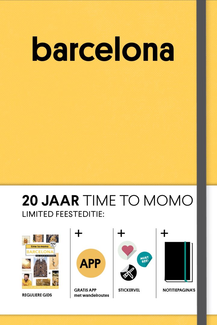 De time to momo gidsen bestaan 20 jaar en dat vieren wij! Onze acht meest populaire\nbestemmingen hebben we geüpgraded tot een luxe feesteditie met veel extra’s: een\nstickervel om favoriete hotspots of je hotel te markeren op de kaart; notitiepagina’s om\nje eigen point of interests toe te voegen,je uitgaven bij te houden, wat te schetsen of\nte schrijven; een handig en vrolijk elastiek,en last but not least: een linnen look flexibound\nomslag. En de vertrouwde gids plus routekaarten en stadsplattegrond zitten er natuurlijk\nook in.\nAcht pareltjes om allemaal te hebben!\nLuxe limited editie\nMet stickervel\nMet 16 notitiepagina’s\n\nMet time to momo Barcelona haal je alles uit je stedentrip! En deze nieuwe editie heeft een volledige corona-update ondergaan. Stap je hotel uit en loop regelrecht naar de leukste wijken van de stad. Op weg naar nieuwe restaurantjes, de beste koffie en dat lokaal gebrouwen biertje. Bij time to momo delen lokale auteurs uit liefde voor hún stad alleen de echte highlights met je. Zo sla je de drukke dertien-in-een-dozijn-winkelstraten over en wandel je, terwijl je onderweg een bezienswaardigheid meepikt, naar de leukste adressen waar de locals zelf graag komen.\n\nMet 6 verrassende routes door de verschillende wijken van Barcelona kun je de stad in je eigen tempo ontdekken én de lokale lifestyle beleven. \n\nInclusief: \n-\tAlle belangrijke bezienswaardigheden \n-\tMeer dan 250 adressen om te eten, drinken en shoppen\n-\tHandige uitneembare stadsplattegrond én gratis kaart-app\n-\tLeuke top 10-lijstjes\n\nEn nu met gratis app!!\n \ntime to momo is met meer dan 200.000 verkochte gidsen per jaar de bestverkochte stedengids van Nederland en België. We zijn al meer dan 20 jaar een inspiratiebron voor reizigers. Check al onze stedentripbestemmingen, de laatste nieuwe tips en hotelinspiratie op www.timetomomo.com