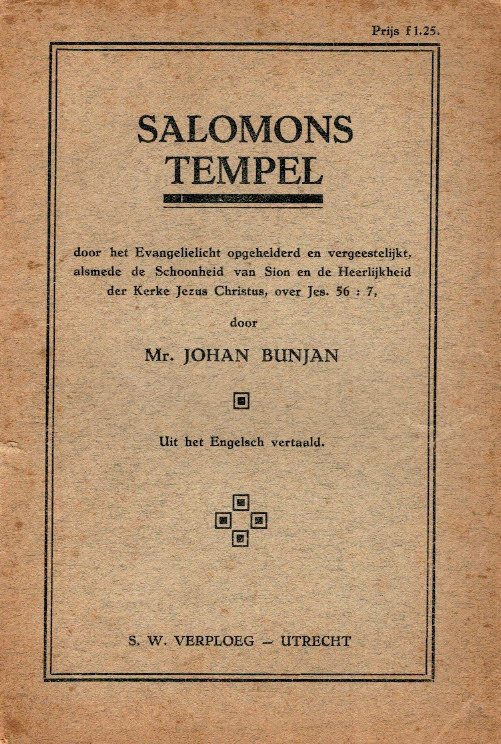 Salomons Tempel door het Evangelie-licht opgehelderd en vergeestelijkt, als mede De schoonheid van Zion, en de heerlijkheid der Kerke Jezus Christus, over Jesaja 56:7 door Mr. Johan Bunjan. Uit het Engelsch vertaald. Nieuw, behalve de spelling onveranderde uitgave. |