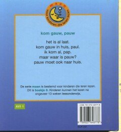 | Meer info: | kom gauw, pauwauteur Dirk Nielandtillustrator Marjolein Pottiehet is al laat.kom gauw in huis, paul.ik kom al, pap.maar waar is pauw?pauw moet ook naar huis. |