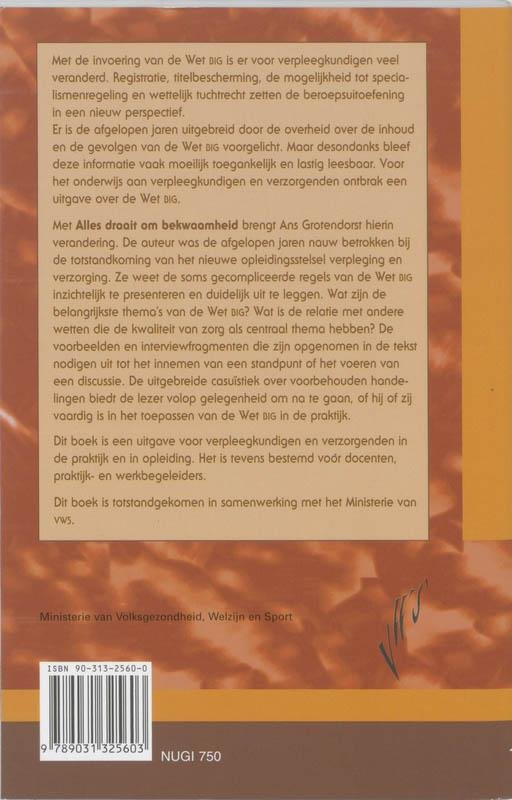 Dit boek gaat over de betekenis en gevolgen van de invoering van de BIG-wet, de wet op de beroepen in de individuele gezondheidszorg. Het richt zich op verpleegkundigen en verzorgenden. Het doel van de wet, de titelbescherming, deskundigheid en opleidingseisen, voorbehouden handelingen en het tuchtrecht worden beschreven met het oog op juist deze twee beroepsgroepen. Door gebruik te maken van cases en citaten wordt de lezer geprikkeld om over bepaalde situaties zijn oordeel te vormen. Aan het eind van het boekje worden deze cases besproken. Het is door deze opzet en mede door het duidelijke taalgebruik een handzaam boekje voor de praktijk geworden.