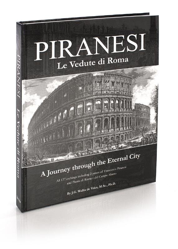 All 137 etchings including 2 prints of Francesco Piranesi and Pianta di Roma e del Campo Marzo.\nThis large format size book on Piranesi etchings follows the first French Edition of 1803. The book includes full reproductions of all the 135 etchings of the 'Vedute di Roma' made by Giambattista Piranesi plus 2 etchings made by his son Francesco and the Pianta di roma e del Campo Marzo. This series is produced directly from a complete original Piranesi catalogue. (The Pianta will be a nine-fold inlay) together with a commetary by the architectural historian Dr. Gijs Wallis de Vries. \nTo draw us into wonderland, Piranesi adds a second frontispiece to the views of Rome, an entirely fictive capriccio. Etched with rippling chiaroscuro, a bridge spans a dry moat filled with antique debris. On it, two gesticulating figures are the only signs of life, but their existence is insignificant compared to the many statues and their lively expressions. A group of busts of effeminate men seem to mock Dea Roma, the goddess of Rome, whose statue occupies the centre of the plate. She has clearly failed to preserve the eternal city from its fall! Behind her a temple emerges out of white smoke, in ruin, invaded by nature.
