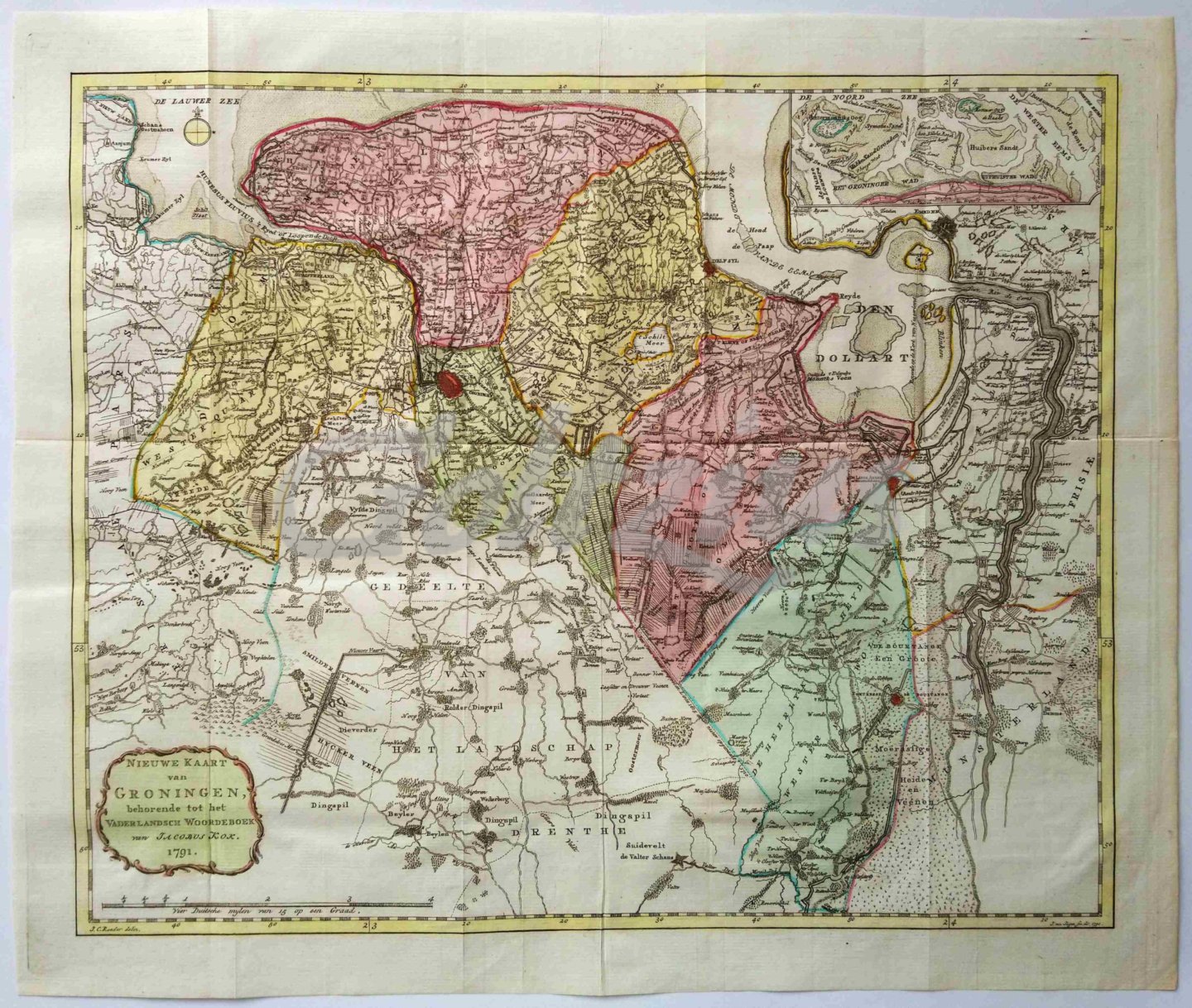 Nieuwe kaart van Groningen Map of the Dutch province of Groningen. Engraving on hand laid paper, with hand colouring. Sheet size 435 x 364 mm., platemark 420 x 350 mm. Made by Jan van Jagen (1707-1800) after J.C. Roeder, and published in Jacobus Kok, 'Vaderlandsch Woordenboek', Amsterdam: Johannes Allart, 1780-1796. This map dated 1791. In very good condition, with folds, as issued, margin edges minimally discoloured.