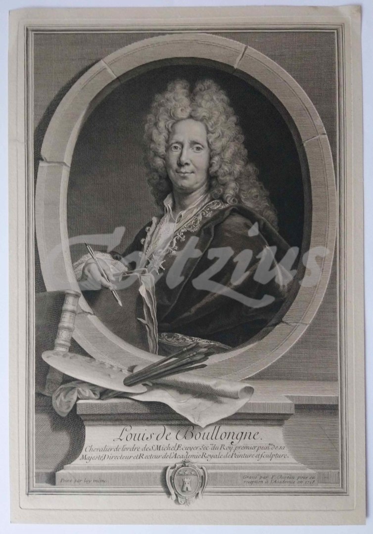 Louis de Boullonge Oval portrait of the painter Louis de Boullonge (II) (1654-1733). Etching and engraving on wove paper, sheet size 276 x 403 mm., platemark 261 x 382 mm. Engraved by François Chereau (I) (1680-1729), after Louis de Boullonge (II). According to the inscription, Chereau made the engraving in 1718 to enter the Académie. In very good condition, with a small repaired tear in the left margin (not affecting image). IFF IV.322: 28; LeBlanc II.8: 21 (ii/2).
