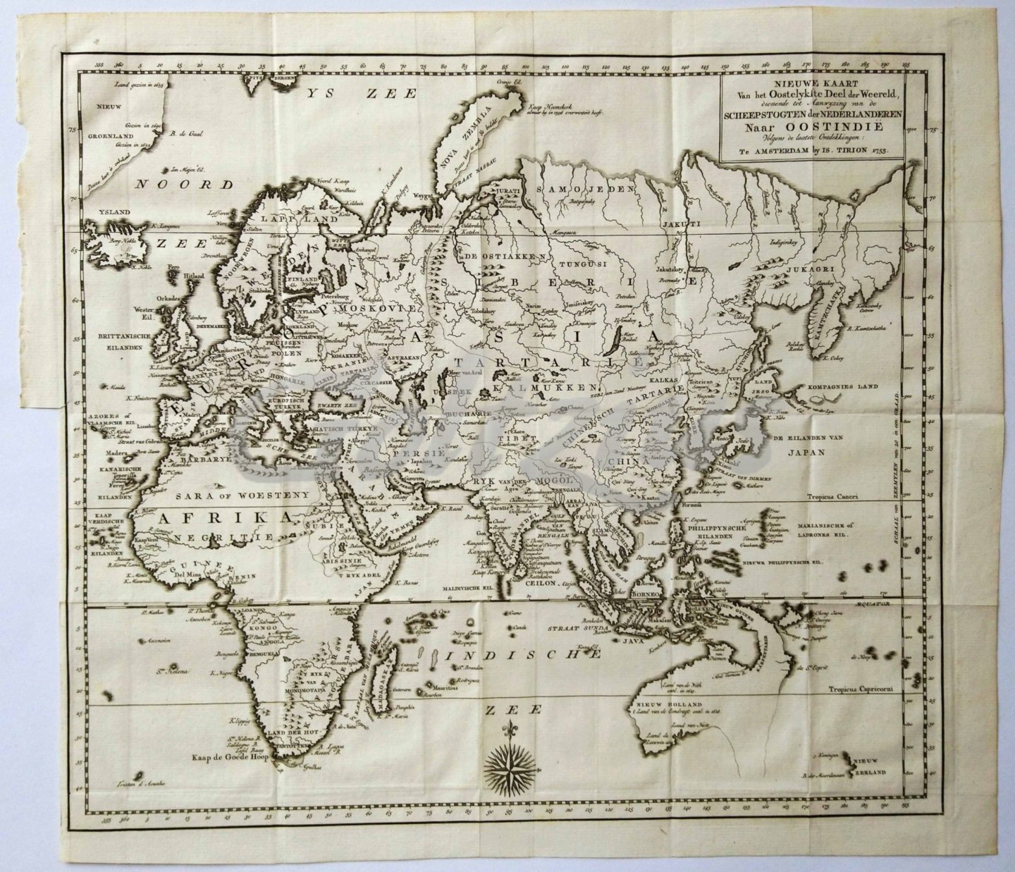 Nieuwe kaart van het Oostelykste Deel der Weereld Map of the eastern hemisphere, from Europe and Iceland to Siberia and Indonesia, with the then discovered coast of Australia. Engraving on hand laid paper, sheet size 403 x 348 mm., platemark 370 x 324 mm. Engraving published by Is. Tirion in Amsterdam, 1753. This map originates from the multi-volume publication 'Hedendaagsche Historie, of Tegenwoordige Staat van alle volken', published by Is. Tirion. In very good condition, multiple folds, as issued.