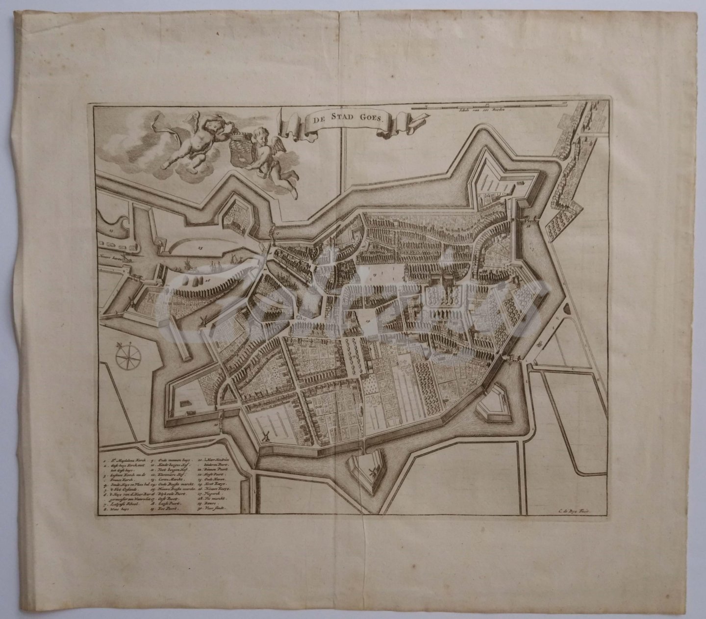 De stad Goes Plan of the Dutch city Goes, in Zeeland. Two putti hold a shield with the coat of arms of the city. A keyed legend with 30 entries lower left. Engraving on hand laid paper, sheet size 443 x 392 mm., platemark 340 x 277 mm. Made by C. de Bye, ca. 1696. This map was published in Smallegange, Mattheus, 'Nieuwe cronyk van Zeeland, eerste deel', Middelburg: J. Meertens, 1696. In good condition, middle fold, as issued. A printing fold just beside the middle fold, extending a few cms. into the image area. Creasing in the left and right margin edges.