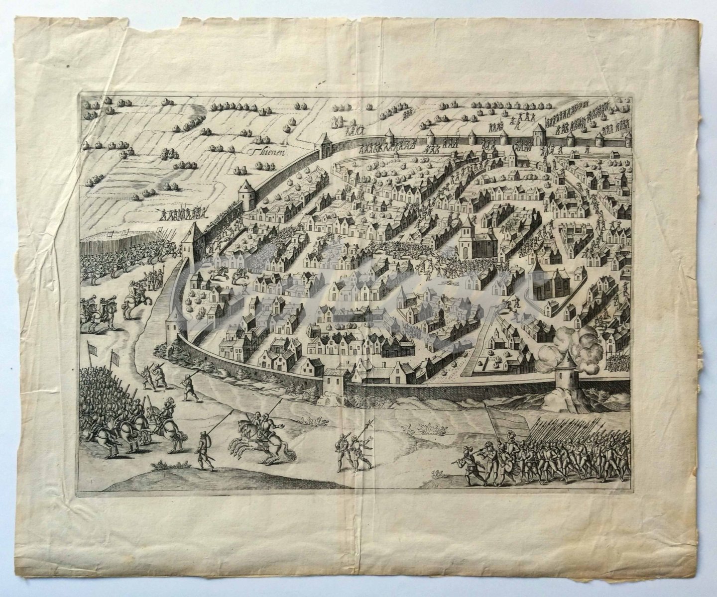 Bird's eye view of the siege of Tienen Titled 'Thienen', this engraving originates from 'La genealogie des illustres comtes de Nassau' by Jan Jansz. Orlers, Leiden: Orlers, 1620. Engraving on hand laid paper, sheet size 380 x 315 mm., platemark 313 x 228 mm. In fair condition, two tiny wormholes in the image area, a few more in the margins. Middle fold, as issued, and creasing in the left and right edges (slightly crossing the image area).