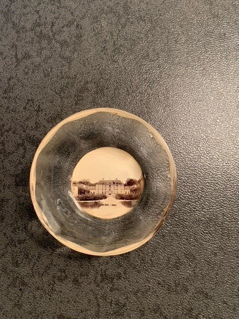 | Meer info: | Het slot Zeist Small glass bowl with round photograph of Slot Zeist on the bottom. Souvenir. 8cm. ca. 1950. |