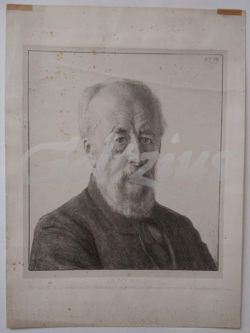 Portrait of J.A. Boland Johannes Arnoldus Boland (1838-1922) was a Dutch graphic artist and draughtsman, who was assisstant of the Rijksprentenkabinet of the Rijksmuseum Amsterdam from 1886 to 1917. This print was made to commemmorate his departure from the Rijksprentenkabinet at age 78. Lithograph on chine-collé, sheet size 347 x 469 mm., image size 296 x 338 mm. Proof before lettering by Georg Rueter (1875-1966). The design for the caption and dating of the print are added in pencil. The portrait itself seems fully finished at this point. The final caption will be: 'J.A. Boland bij zijn vertrek van 's Rijks Prentenkabinet aangeboden door Ambtenaren en Commissie van Toezicht van 's Rijks Museum'. In good condition, some scattered foxing and a faint crease in the top edge of the sheet.