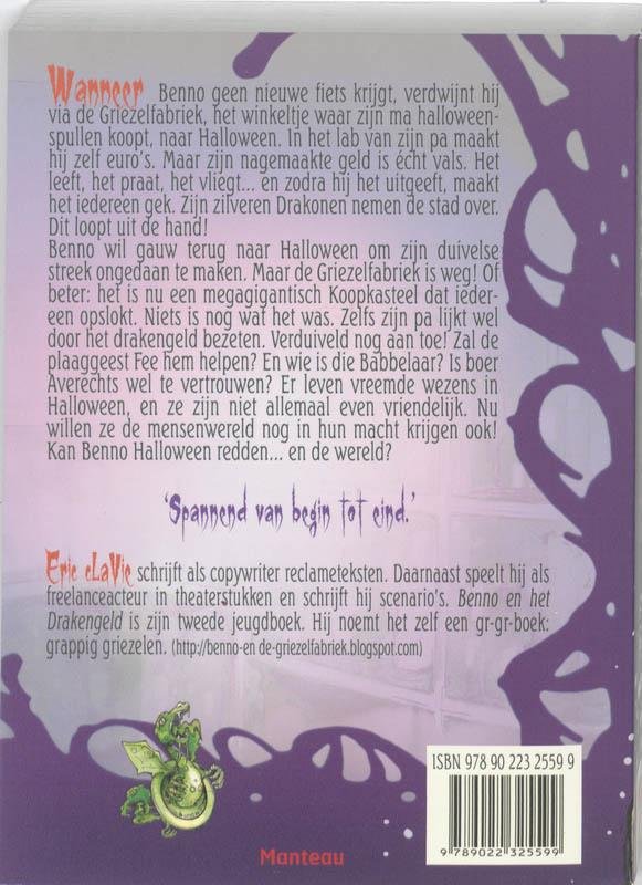 Benno wil gauw terug naar Halloween om zijn duivelse streek ongedaan te maken. Maar de Griezelfabriek is weg! Of beter: het is nu een megagigantisch Koopkasteel dat iedereen opslokt. Niets is nog wat het was. Zelfs zijn pa lijkt wel door het drakengeld bezeten. Verduiveld nog aan toe! Zal de plaaggeest Fee hem helpen? En wie is die Babbelaar? Is boer Averechts wel te vertrouwen? Kan de afwalvis hem helpen? Er leven vreemde wezens in Halloween, en ze zijn niet allemaal even vriendelijk. Nu willen ze de mensenwereld nog in hun macht krijgen ook! Kan Benno Halloween redden... en de wereld? |