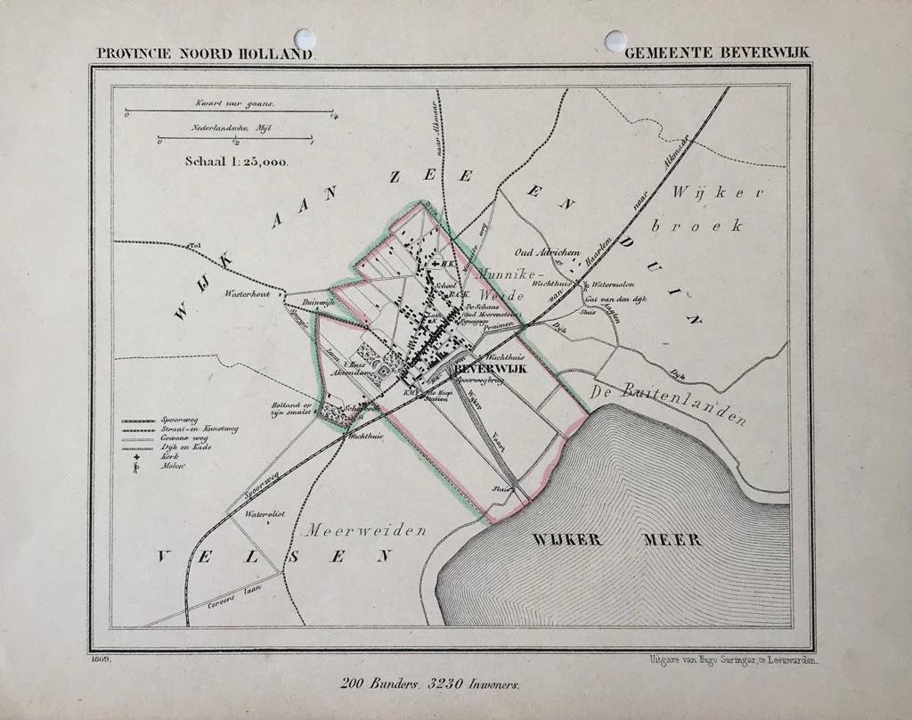 | Bijzonderheden: | Original lithography printed by Hugo Suringar te Leeuwarden.Beverwijk. Deelkaart Provincie Noord-Holland. Plattegrond gemeente Beverwijk. Aan de onderzijde staat vermeld oppervlakte 200 bunders en 3230 inwoners. Links legenda. Afkomstig uit het ja... |