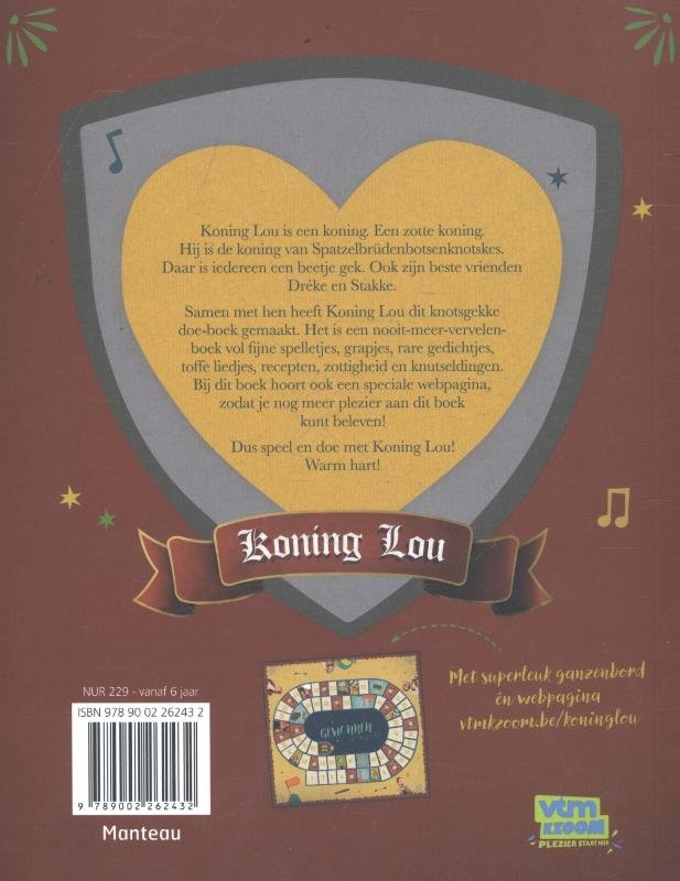 Koning Lou is een koning. Een zotte koning. Hij is de koning van Spatzelbrüdenbotsenknotskes. Daar is iedereen een beetje gek. Ook zijn beste vrienden Dréke en Stakke. Samen met hen heeft Koning Lou dit knotsgekke doe-boek gemaakt. Het is een nooit-meer-vervelenboek vol fijne spelletjes, grapjes, rare gedichtjes, toffe liedjes, recepten, zottigheid en knutseldingen. Bij dit boek hoort ook een speciale webpagina, zodat je nog meer plezier aan dit boek kunt beleven! Dus speel en doe met Koning Lou! Warm hart! Met superleuk ganzenbord én webpagina vtmkzoom.be/koninglou