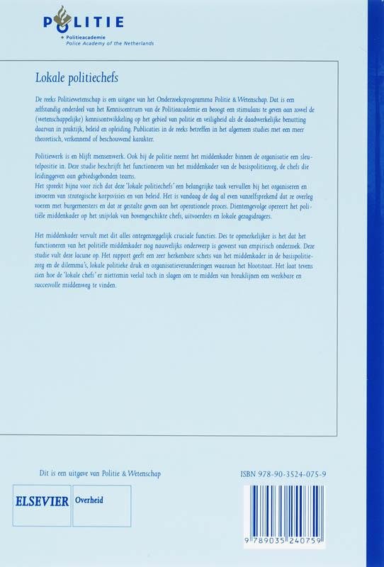 Lokale politiechefsDe reeks Politiewetenschap is een uitgave van het Onderzoeksprogramma Politie & Wetenschap. Dat is een zelfstandig onderdeel van het Kenniscentrum van de Politieacademie en beoogt een stimulans te geven aan zowel de (wetenschappelijke) kennisontwikkeling op het gebied van politie en veiligheid als de daadwerkelijke benutting daarvan in praktijk, beleid en opleiding. Publicaties in de reeks betreffen in het algemeen studies met een meer theoretisch, verkennend of beschouwend Karakter.Politiewerk is en blijft mensenwerk. Ook bij de politie neemt het middenkader binnen de organisatie een sleutelpositie in. Deze studie beschrijft het functioneren van het middenkader van de basispolitiezorg, de chefs die leidinggeven aan gebiedsgebonden teams.Het spreekt bijna voor zich dat deze 'lokale politiechefs' een belangrijke taak vervullen bij het organiseren en invoeren van strategische korpsvisies en van beleid. Het is vandaag de dag al even vanzelfsprekend dat ze overleg voeren met burgemeesters en dat ze gestalte geven aan het operationele proces. Dientengevolge opereert het politiële middenkader op het snijvlak van bovengeschikte chefs, uitvoerders en lokale gezagsdragers.Het middenkader vervult met dit alles ontegenzeggelijk cruciale functies. Des te opmerkelijker is het dat het functioneren van het politiële middenkader nog nauwelijks onderwerp is geweest van empirisch onderzoek. Deze studie vult deze lacune op. Het rapport geeft een zeer herkenbare schets van het middenkader in de basispolitiezorg en de dilemma's, lokale politieke druk en organisatieveranderingen waaraan het blootstaat. Het laat tevens zien hoe de 'lokale chefs' er niettemin veelal toch in slagen om te midden van breuklijnen een werkbare en succesvolle middenweg te vinden.