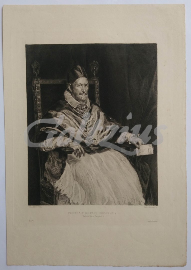 Portrait du Pape Innocent X Portrait of Pope Innocent X (Latin: Innocentius X; 1574-1655), born Giovanni Battista Pamphili, was head of the Catholic Church and ruler of the Papal States from 15 September 1644 until January 1655. Etching on laid paper, sheet size 303 x 437 mm., platemark 267 x 338 mm., etching by Emile Buland, after Velazquez, and printed by Charles Chardon for the periodical 'L'Art', c. 1880 Jean-Emile Buland (1857-1938), was a French painter, engraver, lithographer and illustrator. Diego Rodríguez de Silva y Velazquez (1599-1660), was the leading artist in the court of King Philip IV, and one of the most important painters of the Spanish Golden Age. In excellent condition, with only some faint scattered foxing in the right margin. The collection stamp of the Print Rooms of Leiden University on the verso (Dubbel R.P.K.L., Lugt 700b).This famous painting can still be seen at the Galleria Doria Pamphilii in Rome.