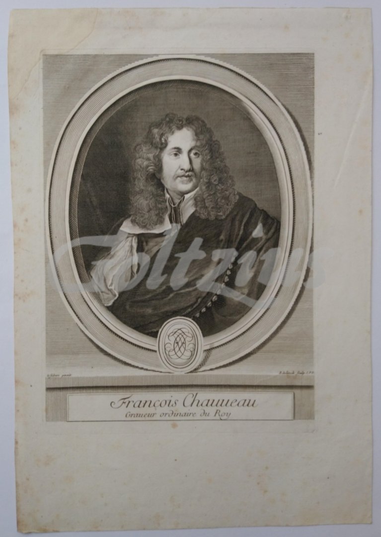 François Chauveau Oval portrait of French engraver François Chauveau (1613-1676). Etching and engraving on hand laid paper, sheet size 244 x 356 mm., platemark 188 x 262 mm., engraved by Gerard Edelinck (1649-1707) after Claude Lefèbvre (1632-1675). This print was published in Perrault's 'Les Hommes illustres' (Paris, 1696-1700), volume II. In good condition, some light foxing in the margins, a crease in the right margin, and a dampstain in the top left corner (only very slightly covering the image area). References: Robert-Dumesnil 240-1: 166; LeBlanc ii.186: 168.