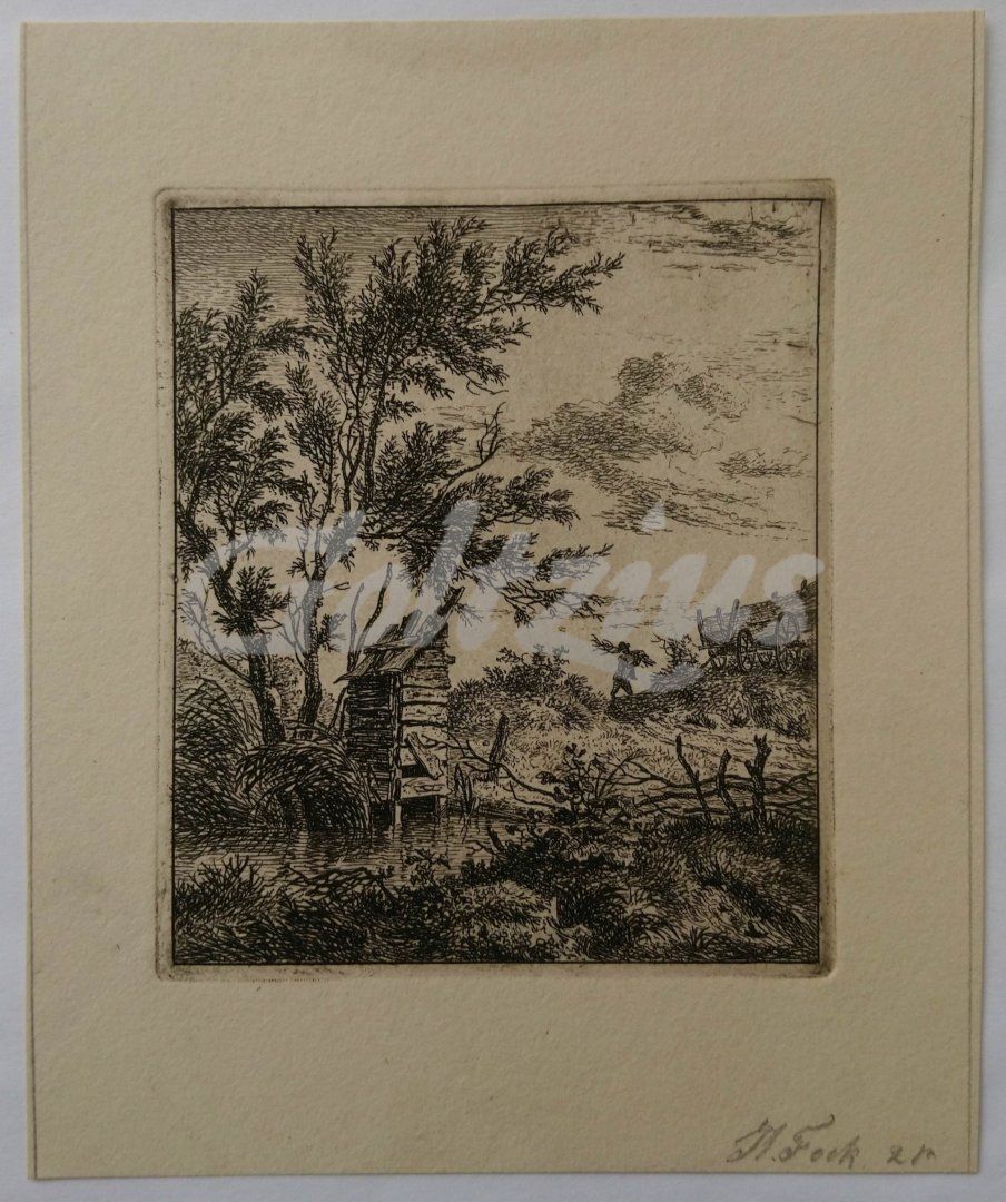 Landscape with outhouse and man with kindling A stream or pond in the foreground, with an outhouse flanked with trees beside it. In the background a man carrying branches walks toward a cart. Etching on laid paper, sheet size 124 x 150 mm., platemark 89 x 103 mm., by Hermanus Fock (1766-1822), c. 1800. In excellent condition. Reference: Hippert & Linnig I.322: 54 ii/2.