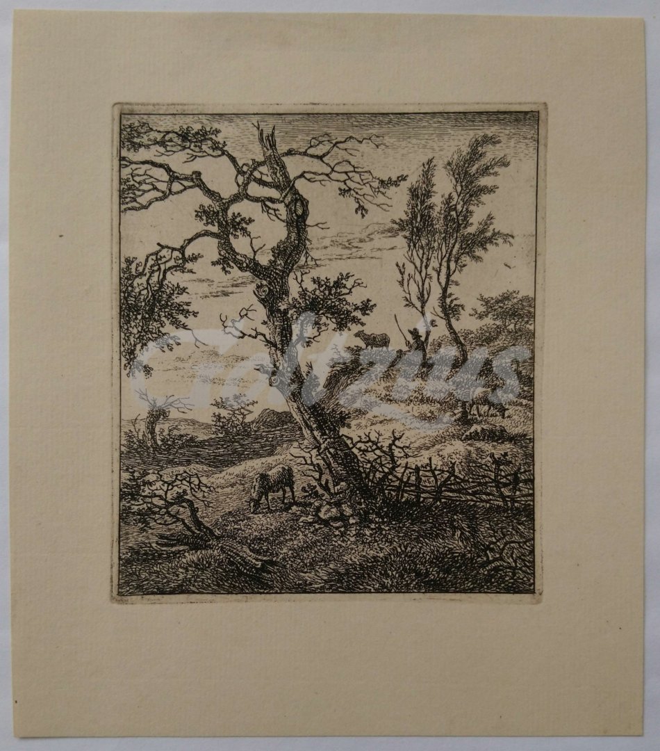 Landscape with sitting shepherd and three sheep Dune landscape with resting shepherd under a tree, and five scattered sheep. Etching on laid paper, sheet size 130 x 148 mm., platemark 89 x 102 mm., by Hermanus Fock (1766-1822), c. 1800. In excellent condition, some very light soiling in the top margin. Reference: Hippert & Linnig I.323: 55 ii/2.