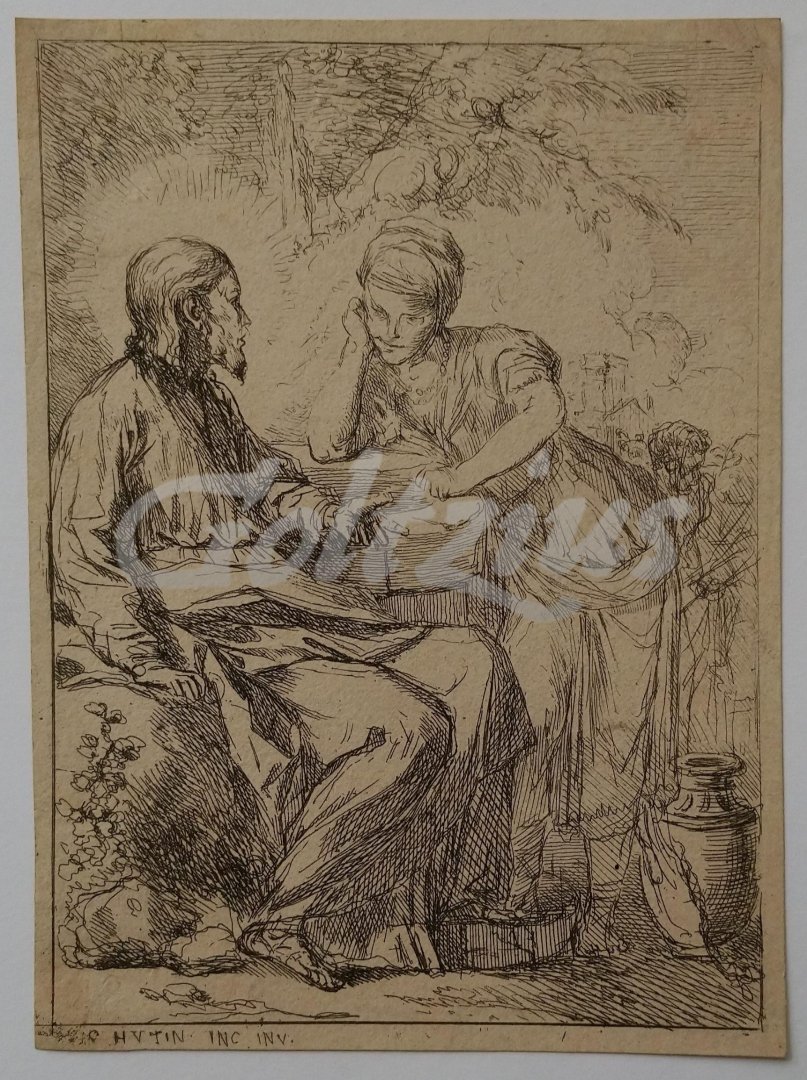Christ and the woman of Samaria at the well Etching on hand laid paper, sheet size 113 x 154 mm., made by Charles François Hutin (-) after his own design. From the series 'Recueil de différents sujets composés et gravés par Charles Hutin à Dresde', published 1763. In good condition, cropped within platemark. Sheet overall a little browned. References: IFF XVIII 11.548: 10.