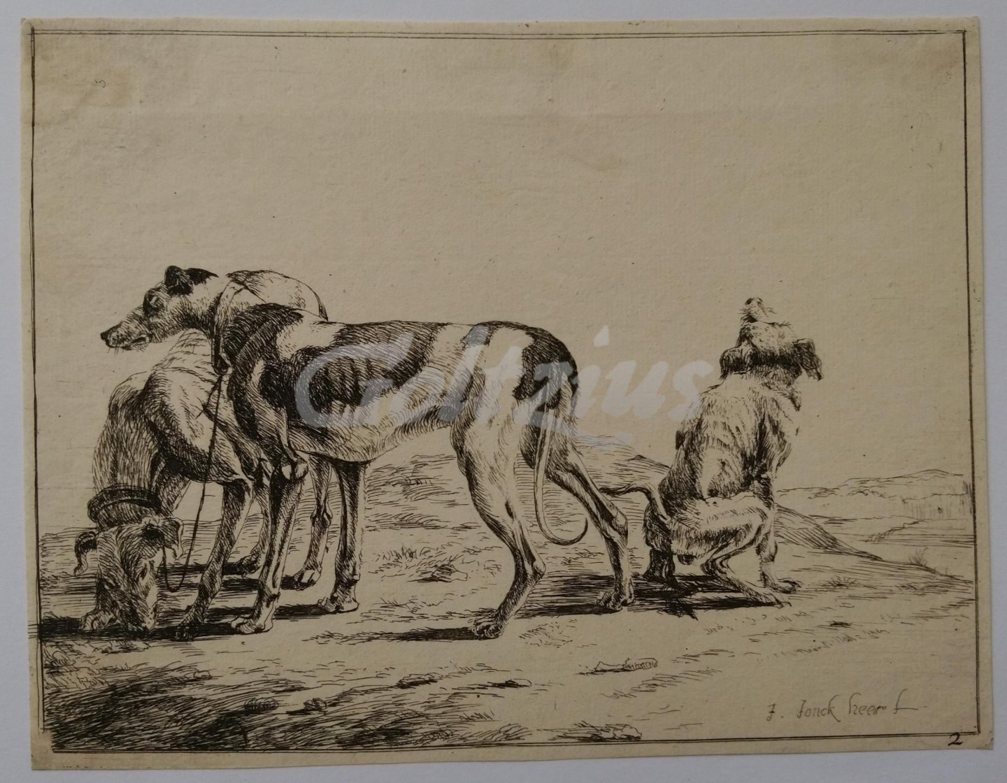 Three greyhounds in a landscape Landscape with three resting greyhounds, one defacating. Etching on hand laid paper, sheet size 177 x 136 mm., etching by Jacob de Jonckheer (died 1676), signed in the plate lower right, as plate 2 in a series of 4 similar plates with dogs titled 'Die folge der Hunde'. In very good condition, cropped within platemark. Faint discolouration in the top corners and top middle (from previous attachment to carrier). Otherwise a clean and fresh impression. With the collection mark of Pim van Eekelen on the verso (Lugt 5101). Reference: Hollstein 221: 1 (iii/4 or iv/4).