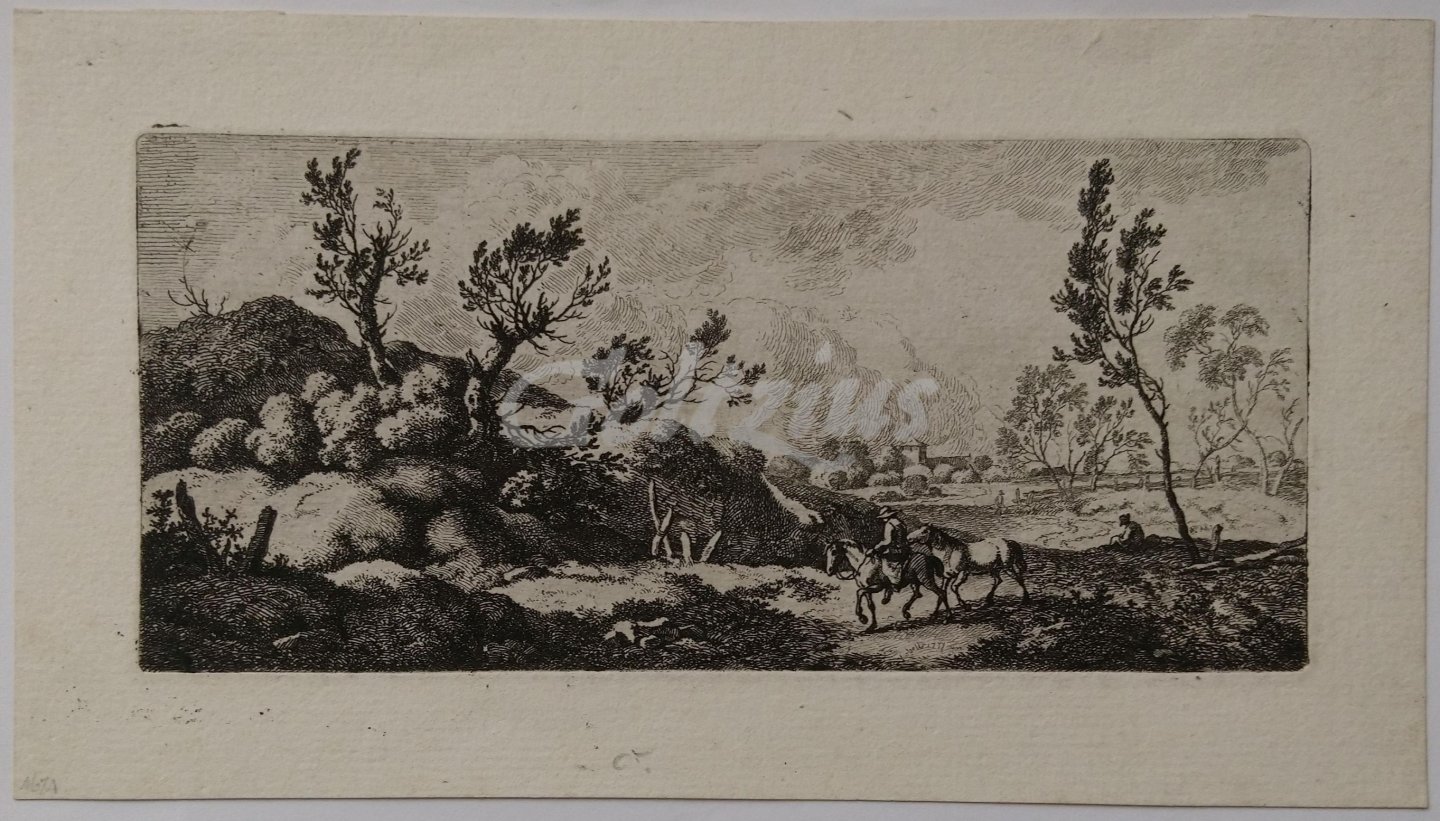 Landscape with rider leading a horse Landscape with trees and grassy knoll, a rider on horseback leading a szecond horse along a path. Someone resting in the shade of a tree to the right. Etching with plate tone on hand laid paper, sheet size 207 x 115 mm., platemark 172 x 78 mm., etching by Ferdinand Kobell (1740-1799), dated 1777. In excellent condition. A collection stamp on the verso (not in Lugt).
