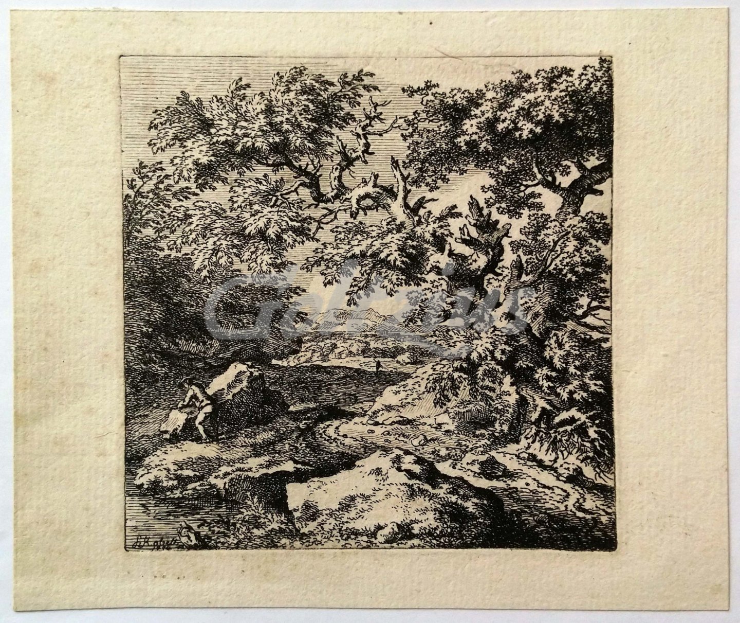 Wooded landscape with figures Forest landscape with a gnarled tree, a man resting on a boulder, and a second figure on the path in the background. Etching on hand laid paper, sheet size 136 x 114mm., platemark 94 x 94 mm., etching by Ferdinand Kobell (1740-1799), c. 1775. In excellent condition, some faint foxing in the left margin. A collection stamp on the verso (not in Lugt).