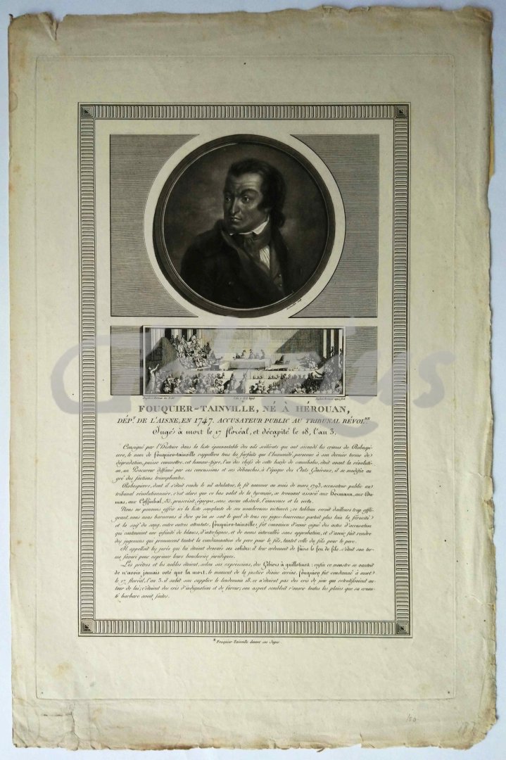 Fouquier-Tainville Portrait of Antoine Quentin Fouquier de Tinville (1746-1795), a French lawyer and public prosecutor during the French Revolution and Reign of Terror. Below the portrait a frieze of a courtroom with Tinville before his judges. Etching (frieze) and aquatint (portrait) on wove paper, sheet size 326 x 497 mm., platemark 284 x 435 mm., aquatint by Charles Levachez (active 1760-1820), etching by Jean Duplessi-Bertaux (1750-1818) after his own design, 1798. An interesting sheet, mixing two graphic techniques for very different effects. In good condition, the margins soiled and with several small tears (all well outside image area). A tape repair for one of the tears.