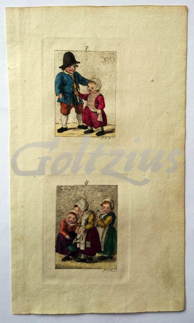 Children Two images on one sheet, the top image of a boy and his sister with a doll; the lower image of three girls with two dolls. Handcoloured etching on hand laid paper, sheet size 116 x 215 mm., made by Pieter de Mare (1758-1796) after Christina Chalon (1749-1808). Illustration from: Johannes Le Francq van Berkhey: 'Zinspelende gedigtjes, op de geestige printjes ge-etst door Pieter de Mare, na de teekeningen van mejuffrouw Christina Chalon, berustende in de verzameling van [...] H.A. Dibbets', Amsterdam: Willem van Vliet, 1793. In very good condition, faint soiling in the lower right margin corner.
