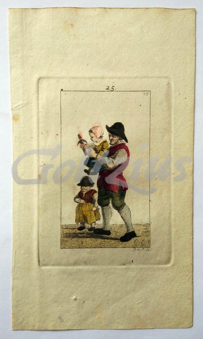 Father with two children A standing man holding a girl with a doll, a second child at his side. Handcoloured etching on hand laid paper, sheet size 113 x 215 mm., platemark 84 x 116 mm., made by Pieter de Mare (1758-1796) after Christina Chalon (1749-1808). Illustration from: Johannes Le Francq van Berkhey: 'Zinspelende gedigtjes, op de geestige printjes ge-etst door Pieter de Mare, na de teekeningen van mejuffrouw Christina Chalon, berustende in de verzameling van [...] H.A. Dibbets', Amsterdam: Willem van Vliet, 1793. In good condition, some faint stains in the margins, one small stain in the image area.