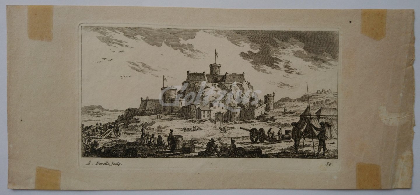 Army camp near a keep Landscape with centrally an imposing fortress. Two cannons are pointing at the castle from the foreground, with army tents and two soldiers standing guard to the right. However, as there are also groups of civilians on the path to the keep, as well as around the cannons and barrels in the foreground, this seems to be a time of peace. Etching on wove paper, sheet size 263 x 118 mm., platemark 169 x 93 mm., by Adam Perelle, after his own design, c. 1650-1695. Adam Perelle (1638-1695) was a French printmaker, from a family of printmakers (his father was Gabriel Perelle, his younger brother Nicolas Perelle), is mostly remembered for his series of depictions of French palaces. This print bears the number 50, so is very probably from a much larger series. Another state bears the number 2 from a series of 12 landscapes. In good condition, with ample margins, and a strong impression. The sheet (except image area) faintly browned, and with tape remains in the four corners (this suggests previous matting).