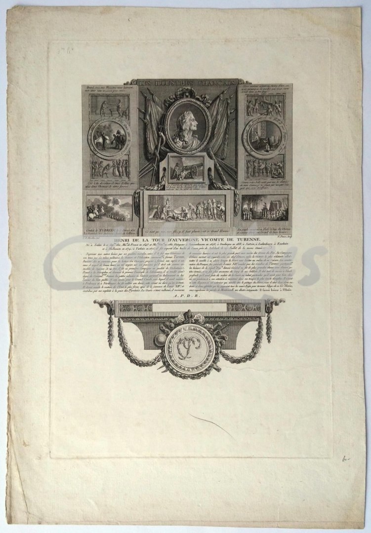 Henri de la Tour d'Auvergne Vicomte de Turenne Allegorical portrait of Henri de La Tour d'Auvergne, vicomte de Turenne (1611-1675), a French general and one six Marshals to have been promoted Marshal General of France. Scenes from the life of the portrayed around the portrait, a French descriptive text below. Etching and engraving on hand laid paper, sheet size 285 x 416 mm., platemark 227 x 336 mm., engraved by Nicolas Ponce (1746-1831) after Clément-Pierre Marillier (1740-1808), and published in the third volume of 'Les illustres français, ou tableaux historiques des grands hommes de la France' (1790-1816). In good condition, dampstains in the top left and right corners, not affecting image. A few creases in the lower half of the image area. Left edge uneven, margins a little soiled.