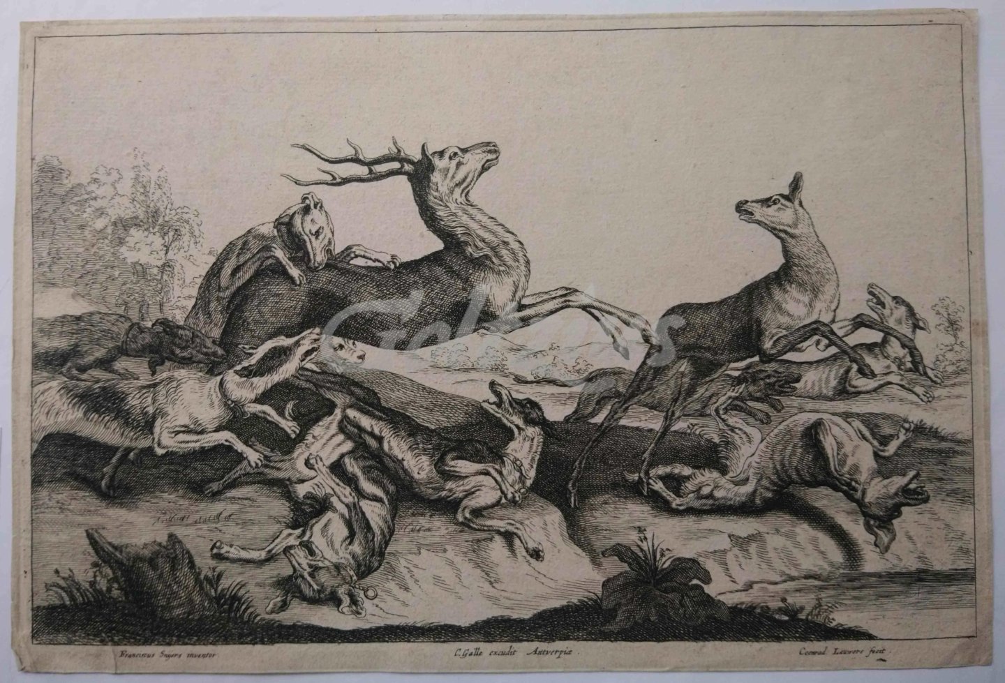 Dogs hunting deer A large pack of hunting dogs attack a couple of deer. Etching on hand laid paper, sheet size 317 x 214 mm., platemark 314 x 213 mm., etching by Conrad Lauwers (Antwerp 1632-Antwerp 1685) after Frans Snijders (Antwerp 1579- Antwerp 1675), and published by Cornelis Galle (I), c. 1650. In good condition, margins cropped close to the platemark. A small nick in the lower edge (minimally affecting image, repaired). Some faint stains in the margins. Reference: Hollstein 29 (only state).