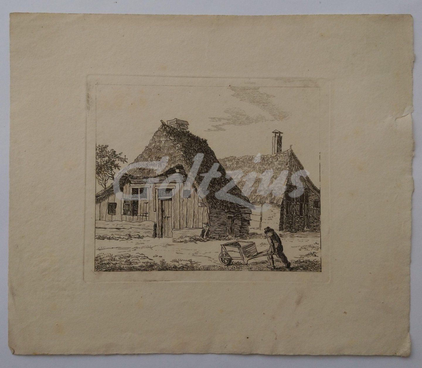 Man with a wheelbarrow near a farmhouse and barn Etching and drypoint on wove paper, sheet size 243 x 206 mm., platemark 150 x 126 mm., etching by Anthonie van den Bos (or: Bosch; Nijmegen 1763-Amsterdam 1838) after his own design. In good condition, ample margins. A small tear in the right margin (not affecting image), lower margin a little soiled, faint staining in the top left corner of the image.