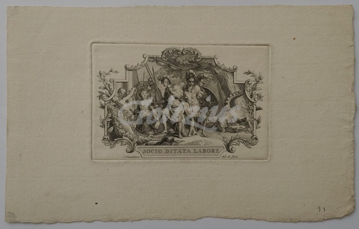 Jason and Medea getting on board of the Argo 'Socio ditata labore': With the just vanquished dragon on the right, Jason and the Argonauts are preparing to take off with Medea and the Golden Fleece. Etching and engraving on hand laid paper, sheet size 243 x 156 mm., platemark 127 x 83 mm., made by Jan Wandelaar after his own design. This print was used as a title vignette in: Covens & Mortier's 'Atlas Nouveau, contenant toutes les parties du Monde [...]', Amsterdam : Covens & Mortier, 1742. However, there is printed text immediately above and below the image on the title page (and the page is a lot larger than here), so this may be a proof printing or separate printing of the plate used in that book. In excellent condition, minimal soiling in the lower left margin corner.