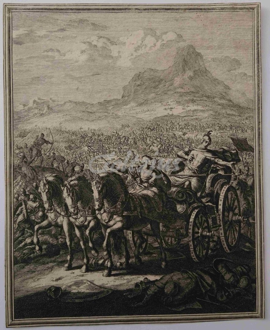 Battle scene in front of a large mountain A tumultuous battle scene with a chariot in the foreground, on which a general whose chest is pierced by an arrow. Etching on hand laid paper, sheet size 203 x 253 mm., etching by an anonymous artist, c. 1650-1700, whose style suggests the work of Romeyn de Hooghe (1645-1708). In good condition, cropped within platemark. A few tiny stains in the top right corner, a pinhole in the lower right corner. The collector's mark of Pim van Eekelen (Lugt 5101) stamped verso.