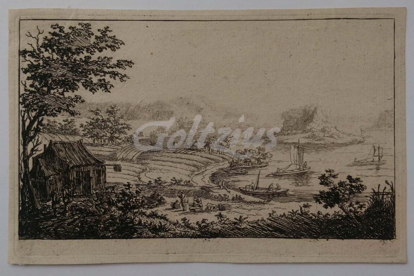 River landscape Several sailling vessels on a wide river with a rocky island in the middle. To the left a structure, and on the riverbank groups of figures. Etching on hand laid paper with watermark, sheet size 160 x 103 mm., platemark 156 x 97 mm., by Jan van Almeloveen (1656-1684) as part of a series of six unnumbered landscapes. In excellent condition, impression with a great deal of contrast. References: Hollstein 31: 31 iii/3 (probably); Bartsch i.295-297: 31; Dutuit 31; LeBlanc i.29: 21.
