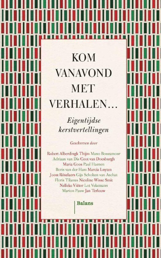 Kom vanavond met verhalen… bevat vijftien hartverwarmende, waargebeurde verhalen van meestervertellers voor aan de kersttafel, rond de kerstboom of gewoon voor bij de centrale verwarming. Want wat is een mooier cadeau om door te geven dan een kerstverhaal? Geschreven door: Robert Alberdingk Thijm, Mano Bouzamour, Adriaan van Dis, Coot van Doesburgh, Maria Goos, Paul Haenen, Boris van der Ham, Marcia Luyten, Joost Röselaers, Gijs Scholten van Aschat, Floris Tilanus, Nicoline Wisse Smit, Nelleke Viëtor, Lot Vekemans, Marion Pauw, Jan Terlouw |