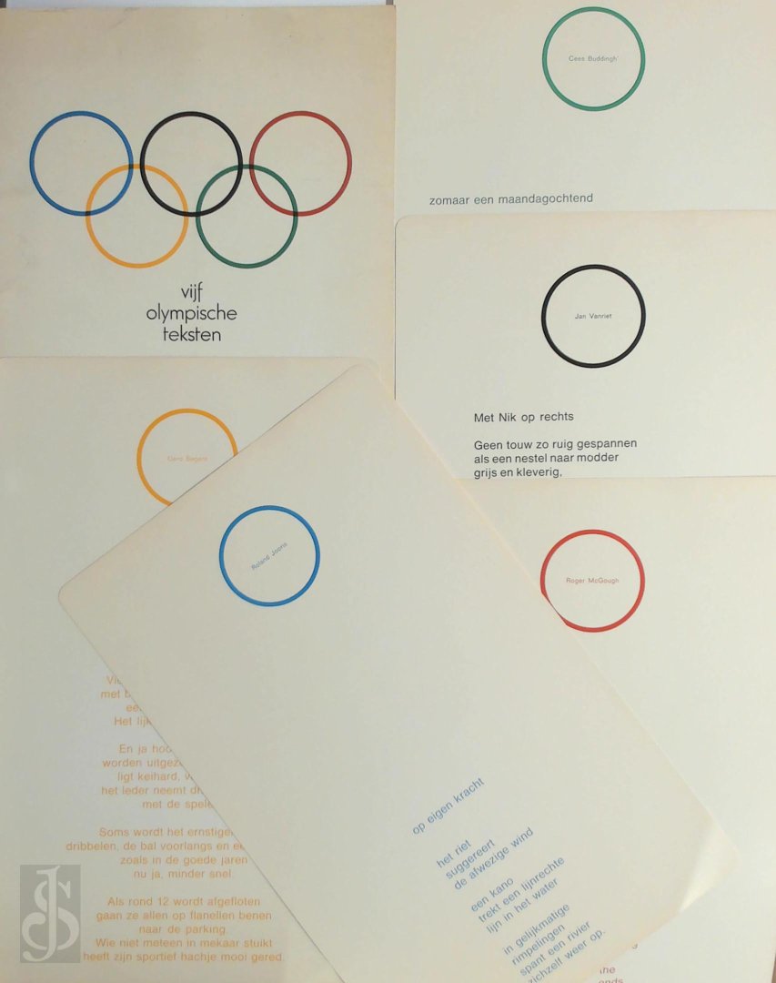 | Meer info: | Eerst uitgave. Mooi vormgegeven losbladige uitgave met 5 gedichten van 5 verschillende dichters. Samen in mapje. |
