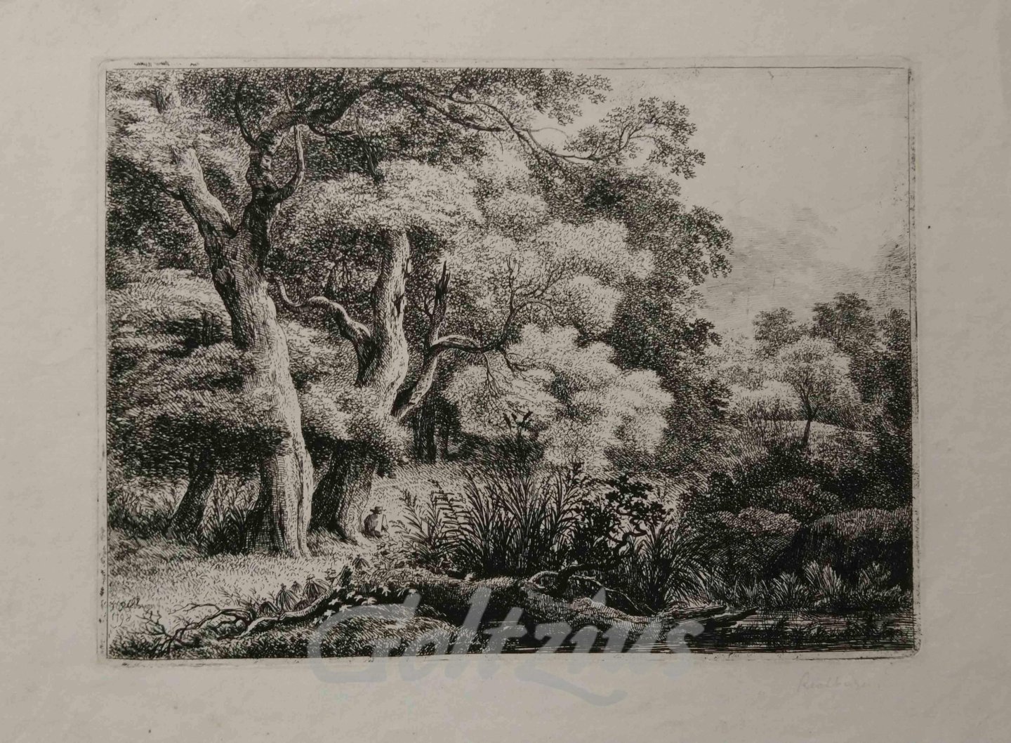 Forest landscape with a solitary figure A single seated man underneath a large tree. To the right a stream with a fallen log extending into it. Etching on wove paper, sheet size 360 x 264 mm., platemark 287 x 213 mm., made by Franz Rechberger (Vienna 1771-1841 Gutenstein), signed and dated 1798 in the plate, additionally signed in pencil lower right. Rechberger was a curator at the Albertina in Vienna, and a stilistic follower of Ruysdael and Van Everdingen. In very good condition, with very faint discolouration from previous framing/matting. With an unidentified (not in Lugt) collector's mark stamped on the verso: "([...]broeke".