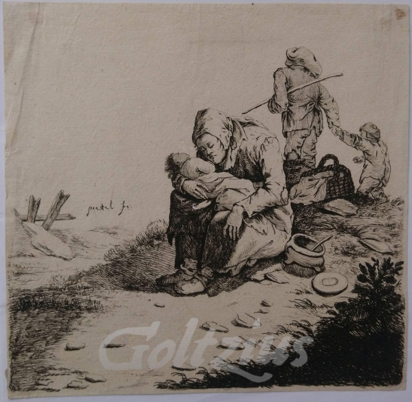 Poor family resting in a landscape A mother in tattered clothes holds a child on her lap. At her side a basket and eating utensils. A man leading a boy by the hand in the background. Etching on hand laid paper, sheet size 172 x 167 mm., made by Johann Gottlieb Prestel (Grönenbach 1739-1808 Frankfurt am Main) after his own design. In good condition, although cropped within platemark. Some faint soiling in the top corners and a crease in the left edge.
