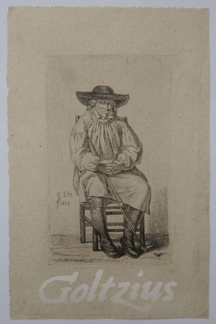 Seated man with a cane A man with cane, seated in a chair. A broken pipe at his feet. Print from a series of twelve: '12 Studie-beeldjes'. Etching on thin laid paper, sheet size 101 x 156 mm., platemark 63 x 105 mm., etching by Anthonie W.H. Nolthenius de Man (Nijmegen 1793-1842 The Hague) after his own design, and dated 1828. In very good condition, some minimal creasing in the margins. References: the Rijksmuseum Amsterdam recognises three states of this print, this corresponds with their third state of three.