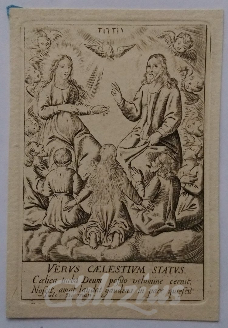 Adoration of Christ and Mary Christ and Mary seated side by side in Heaven, with the Holy Ghost as a dove above them. They are surrounded by cherubs and saints. Engraving on hand laid paper, sheet size 65 x 95 mm., platemark 58 x 87 mm., etching by Jacob de Man (Ieper c. 1643-1719 Antwerp) after own design, c. 1670-1715. In excellent condition, remains of attachment to carrier to the verso.