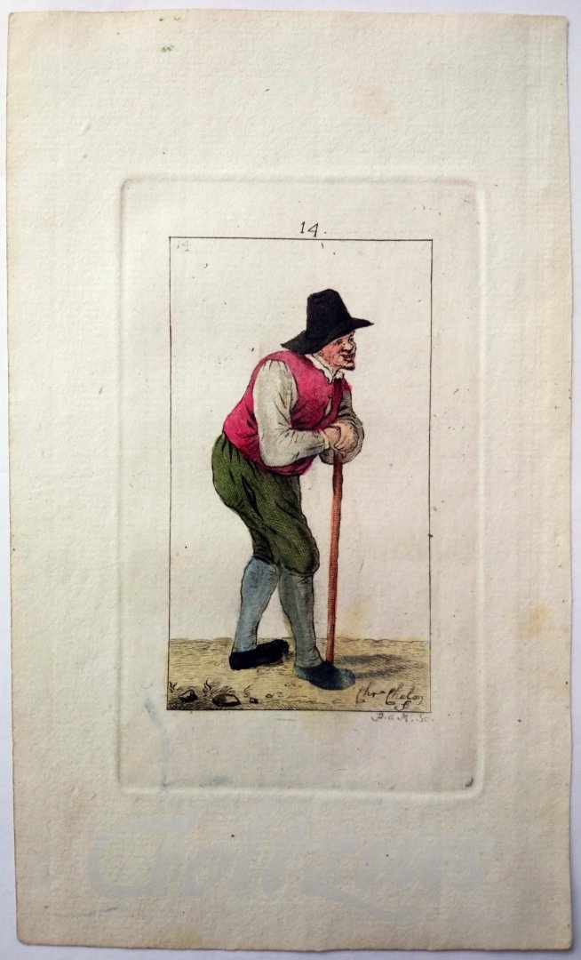Old man with a cane A standing man with hat and goatee, leaning on a cane. Handcoloured etching on hand laid paper, sheet size 120 x 199 mm., platemark 77 x 129, made by Pieter de Mare (1758-1796) after Christina Chalon (Amsterdam 1749-1808 Hazerswoude). Illustration for: Johannes Le Francq van Berkhey: 'Zinspelende gedigtjes, op de geestige printjes ge-etst door Pieter de Mare, na de teekeningen van mejuffrouw Christina Chalon, berustende in de verzameling van [...] H.A. Dibbets', Amsterdam: Willem van Vliet, 1793. The print (number 14) illustrates the poem on page 16. In very good condition, lower margin edge lightly browned, a small stain in the right margin.