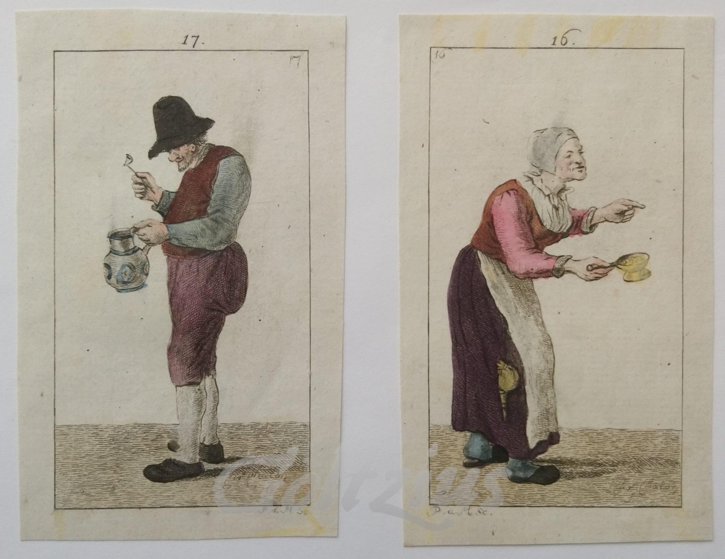 Old man with pipe and jug and old woman with coal burner A standing man holding a pipe and a jug. Two handcoloured etchings on hand laid paper, sheet size 73 x 118 mm., made by Pieter de Mare (1758-1796) after Christina Chalon (Amsterdam 1749-1808 Hazerswoude). These two companion prints together illustrate a short poem in: Johannes Le Francq van Berkhey: 'Zinspelende gedigtjes, op de geestige printjes ge-etst door Pieter de Mare, na de teekeningen van mejuffrouw Christina Chalon, berustende in de verzameling van [...] H.A. Dibbets', Amsterdam: Willem van Vliet, 1793. The prints (number 16 and 17) illustrate a poem in which the man wants a hot coal to light his pipe, and the woman wants a drink from the man's jug. In very good condition, discolouration in the margin edges.