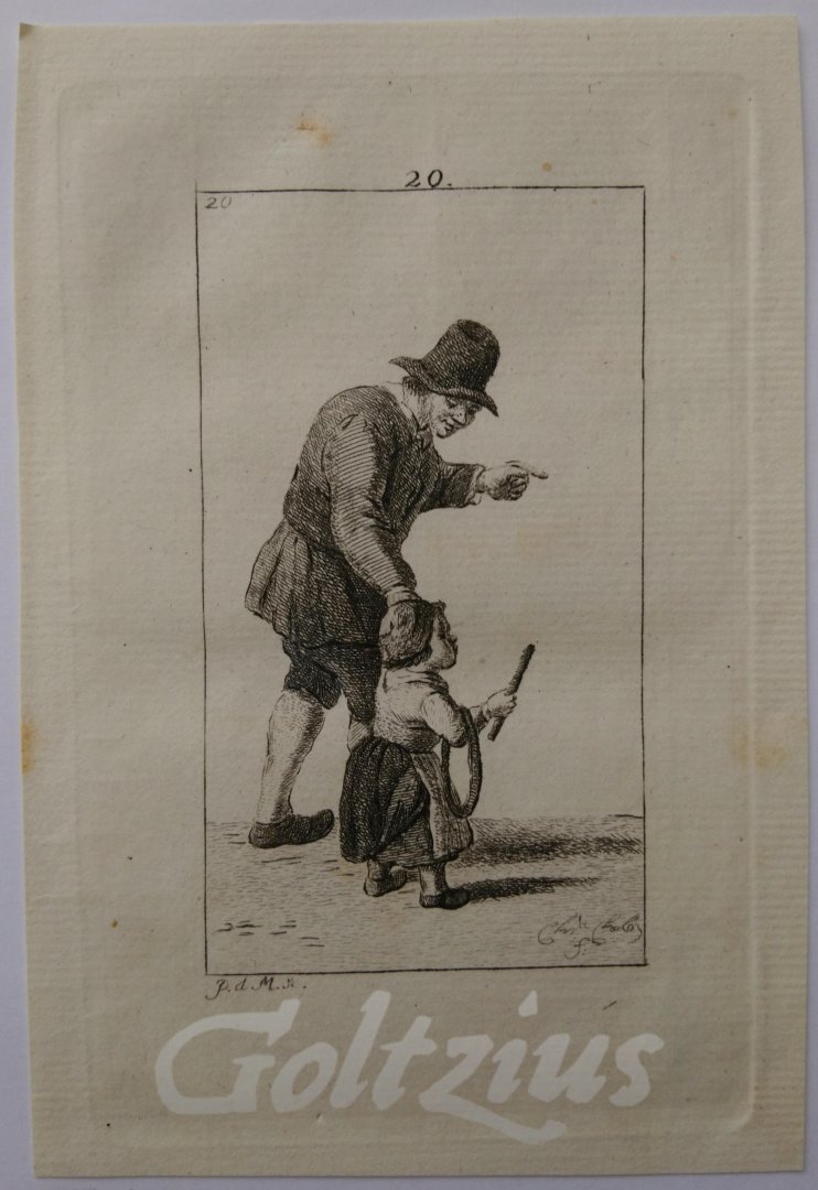 Man teaches his child to trundle a hoop A man points to the distance while looking at his kid. The kid holds hoop and stick. Etching on hand laid paper, sheet size 96 x 141 mm., platemark 82 x 131 mm., made by Pieter de Mare (1758-1796) after Christina Chalon (Amsterdam 1749-1808 Hazerswoude). Illustration for: Johannes Le Francq van Berkhey: 'Zinspelende gedigtjes, op de geestige printjes ge-etst door Pieter de Mare, na de teekeningen van mejuffrouw Christina Chalon, berustende in de verzameling van [...] H.A. Dibbets', Amsterdam: Willem van Vliet, 1793. The print (number 20) illustrates the poem on page 19. In excellent condition, with two spots of foxing in the margins.