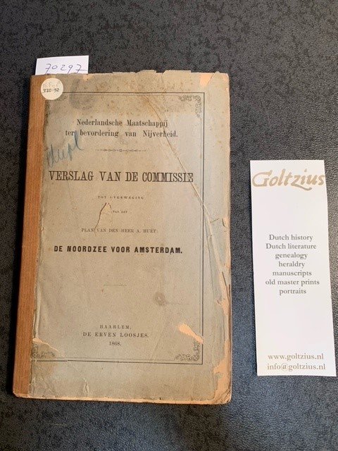 Verslag van de commissie tot overweging van het plan van den heer A. Huet: De Noordzee voor Amsterdam. Nederlandsche Maatschappij ter bevordering van Nijverheid. Haarlem, De Erven Loosjes, 1868, (10)+121pp. original softcover paper binding, spine reinforced, damage to front and back, upper part of front solied. From the library of Hoogheemraadschap van Rijnland. reaction to a plan devised by A. Huet to connect Amsterdam with the north sea (Noordzee) later to become the Noordzeekanaal. Scarce.