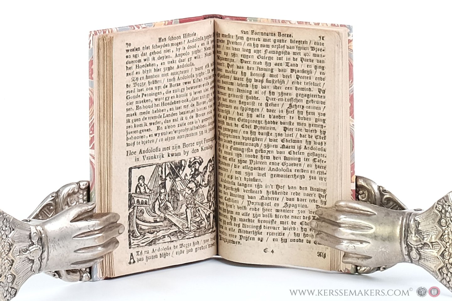 covers marbled paper. 112 pp. With large woodcut (5x7 cm) on title and 38 woodcuts about the same size in text. With decorative woodcut tailpieces. - Paper discolored and with marginal stains; margins very short; outer upper corner of last 6 leaves damaged of which the last leaf with loss of some types, but on the whole, for an often used chapbook in good condition