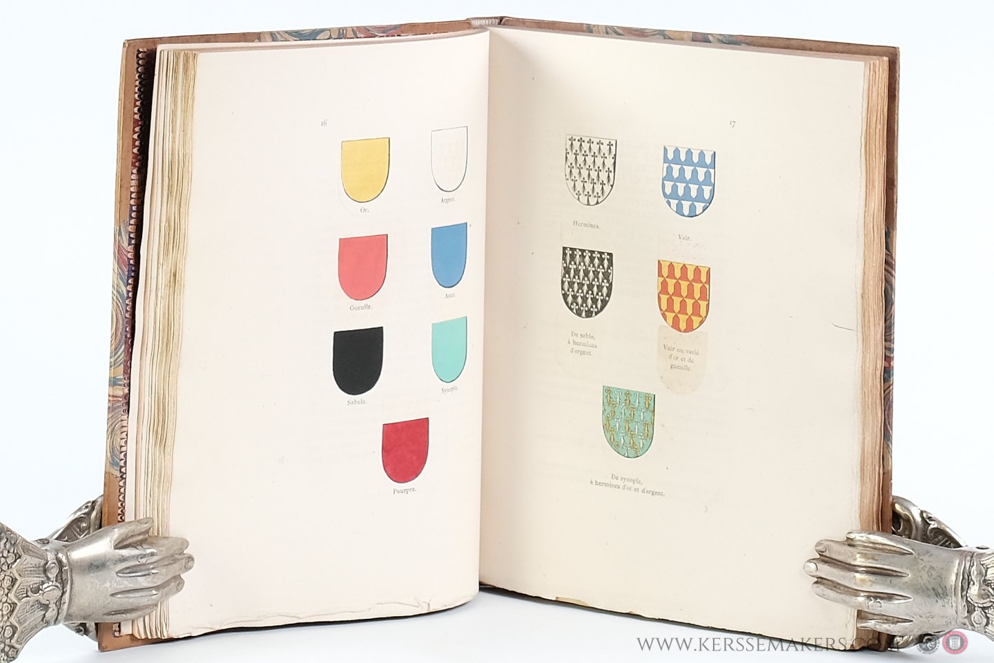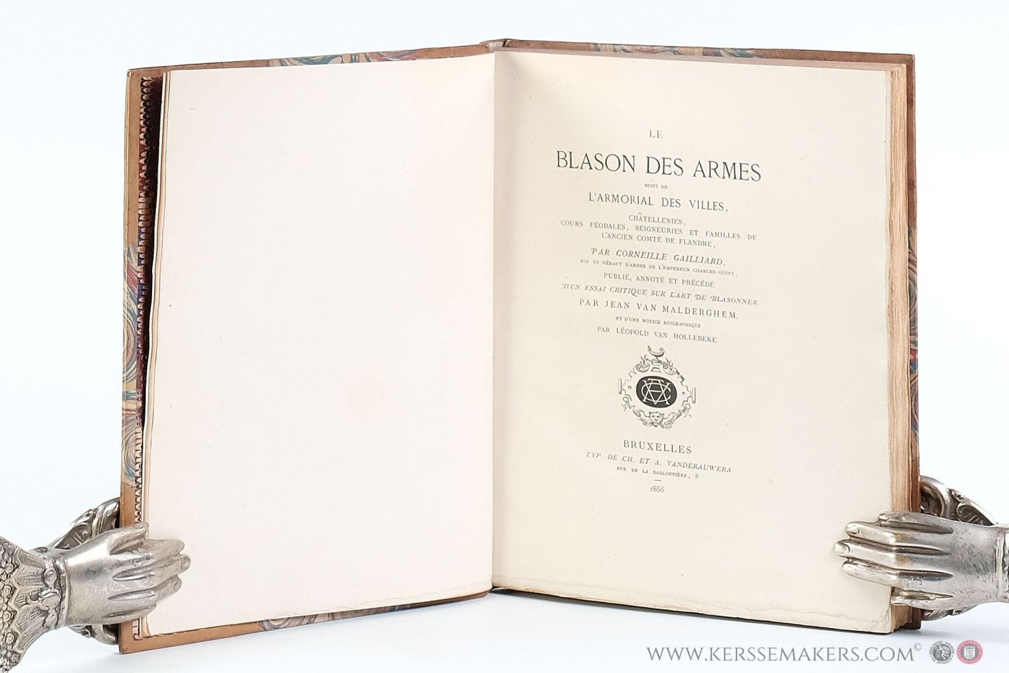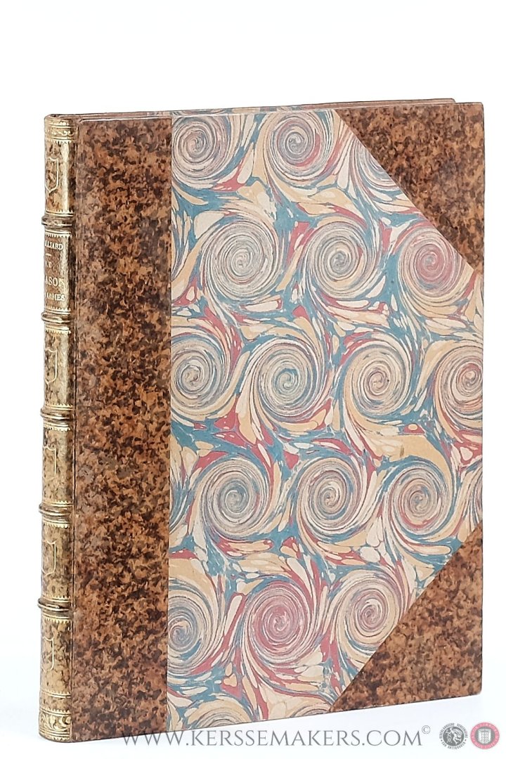covers with marbled paper; marbled endpapers; uncut. (ii: blank), (ii: halftitle), (ii: title) pp. and a composition of 4 sections: 1). Jean van Malderghem. Essai critique sur l'art de blasonner depuis le XIIIe siècle jusqu'à la fin du XVIe. xx pp. - 2). Léopold van Hollebeke. Corneille Gailliard. Notice sur sa vie et ses oeuvres. (ii) pp.: Lithographed frontispiece by J. Petyt after I. Rotsaert of the tombstone of Gailliard, and xliv pp. - 3). Le blason des armes, livre très-utille et subtil pour les gentilzhommes apprendre à blasonner; aussi for commodieulx a plusieurs gens artyficieux comme orfèvres, peintres, imprimeurs, etc. 1557. (ii: title), (ii: Index), (ii) frontispiece in colors engraved by Ch. Onghena after Gailliard, 52 pp. With 11 full-page plates with together 67 illustrations and 77 illustrations in text. Together 144 examples, handcoloured, for filling in coats of arms. - 3). L'anchienne noblese de la très-haulte, très-noble et très-puissante Contée de Flandres avecques leurs armes blasonnez.. . (ii: halfti.), (ii: title), 89,(v) pp. - Beautiful copy, printed on handmade paper. Ex-libris with coat of arms pasted in on first marbled endpaper