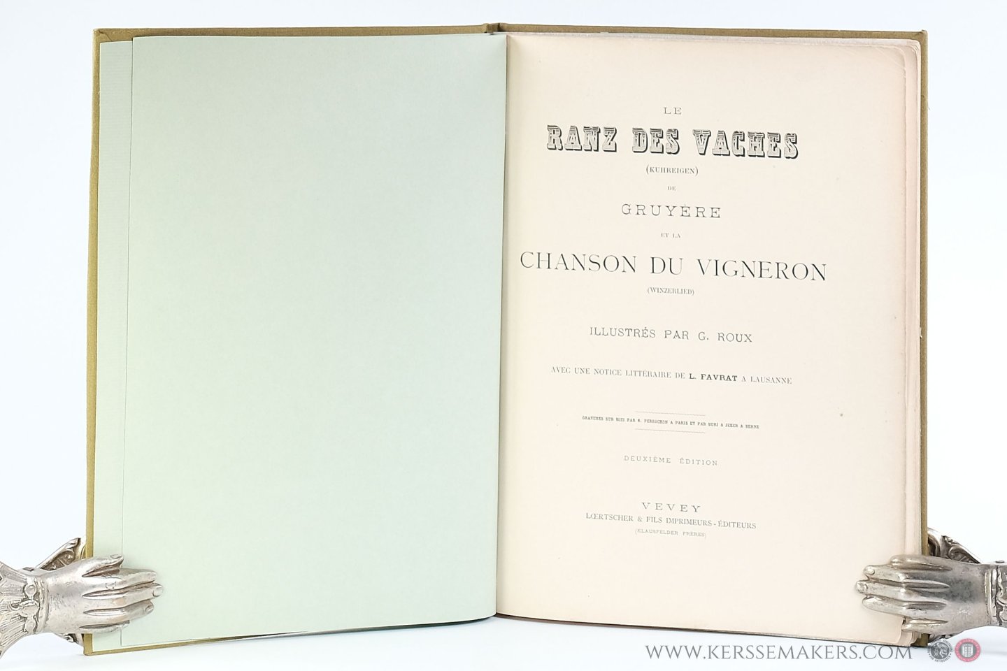 | Titel: | Le ranz des vaches (Kuhreigen) de Gruyère et La Chanson du vigneron (Winzerlied). Illustrés par G. Roux. Avec une Notice littéraire de L. Favrat à Lausanne. Gravures sur bois par G. Perrichon à Paris et par Buri & Jeker à Berne. Deuxième é... |