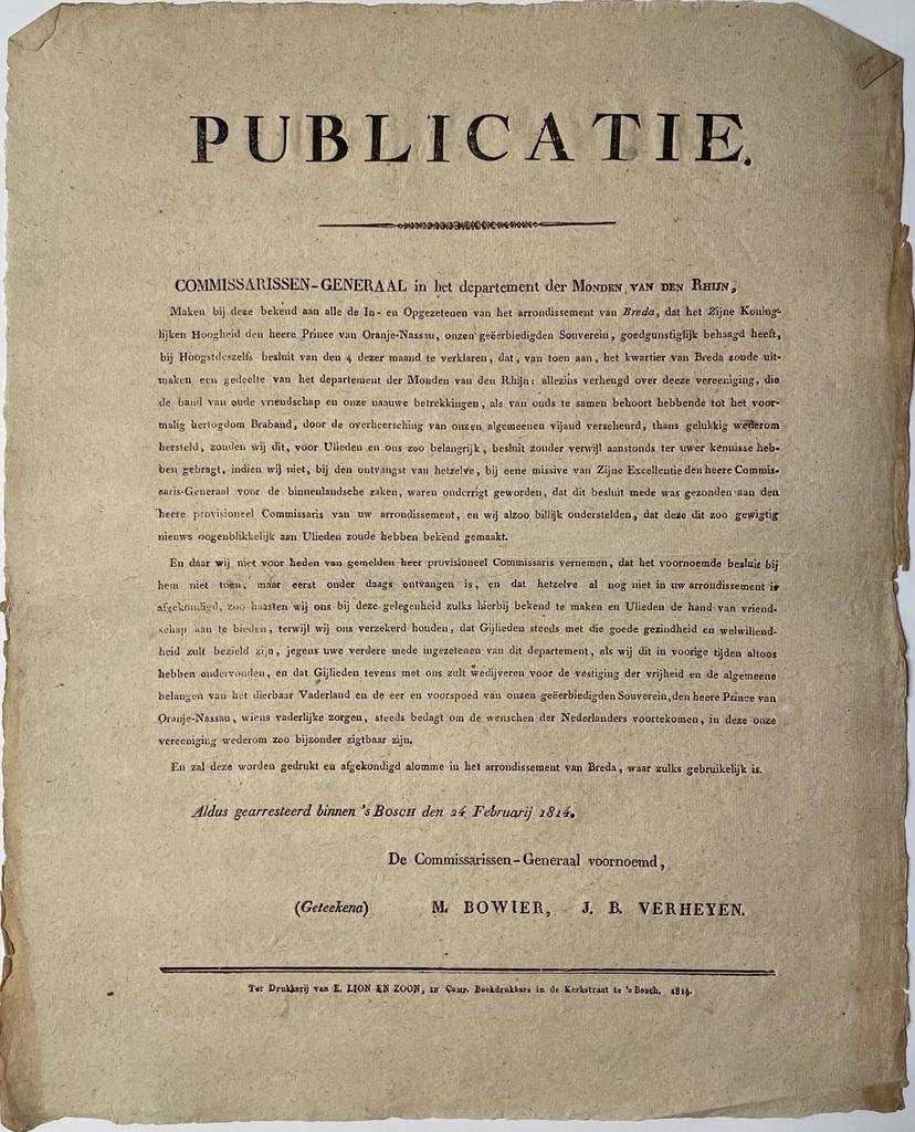 | Titel: | Publication / Affiche 1814, Monden van den Rijn / Rhine | Publicatie. Department der Monden van den Rhijn, kwartier van Breda, E.Lion en zoon 's Hertogenbosch, plano, 1 p. |