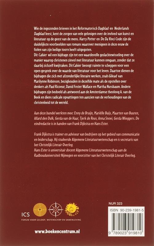 Wie de ingezonden brieven in het Reformatorisch Dagblad en Nederlands Dagblad leest, kent de zorgen van vele gelovigen over de invloed van kunst en literatuur op de geest van de mens. Harry Potter en De Da Vinci Code zijn de duidelijkste voorbeelden van romans waarover menigeen in deze eeuw de fiolen van zijn heilige toorn heeft uitgegoten.Dit Cahier wil een bijdrage zijn tot een waardevolle gedachtewisseling over de manier waarop christenen zinvol met literatuur kunnen omgaan, zonder dat ze daarbij zichzelf kwijtraken. Dit Cahier beoogt ruimte te scheppen voor een open gesprek over de waarde van literatuur voor het leven. Daartoe dienen de bijdragen die zich met afzonderlijke literaire werken, zoals Gilead van Marilynne Robinson, bezighouden in dezelfde mate als de opstellen over denkers als Paul Ricoeur, David Foster Wallace en Martha Nussbaum. Andere bijdragen zijn bedoeld als antwoord aan de Amsterdamse theoloog A. van de Beek en diens radicale opvattingen ten aanzien van de verhoudingen van de christenheid tot de wereld.Aan deze bundel werkten mee: Enny de Bruijn, Mari e Buijs, Maarten van Buuren, Allard den Dulk, Gerda van de Haar, Tjerk de Reus, Anna Snoei, Gerda Wieggers. De eindredactie is in handen van Frank Dijkstra en Hans Ester.Frank Dijkstra is trainer en adviseur van bedrijven op het gebied van communicatie en leiderschap. Hij studeerde Algemene Literatuurwetenschap en is secretaris van het Christelijk Literair Overleg.Hans Ester is universitair docent Algemene Literatuurwetenschap aan de Radbouduniversiteit Nijmegen en voorzitter van het Christelijk Literair Overleg.